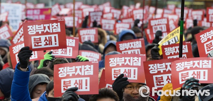 (서울=포커스뉴스) 23일 오후 서울역 광장에서 전국민주노동조합총연맹 회원들이 '민주노총 총파업 선포대회'를 하고 있다.