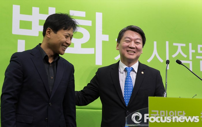 (서울=포커스뉴스) 24일 오전 서울 마포구 국민의당 당사에서 안철수(오른쪽) 인재영입위원장이 곽선우 변호사의 국민의당 합류를 밝히고 곽 변호사를 소개하고 있다.