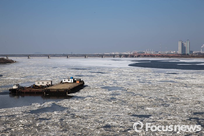 (고양=포커스뉴스) 서울 최저기온이 영하 18도, 체감온도 영하 30도를 기록한 30일 오후 경기도 고양시 행주대교 부근에서 바라본 한강이 얼음으로 뒤덮혀 있다.