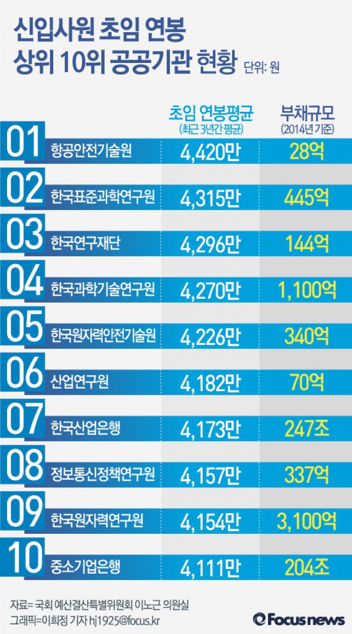(서울=포커스뉴스) 24일 국회 예산결산특별위원회 이노근 의원이 총 316개 공공기관의 2012~2014년까지 최근 3년간 신입사원의 초임 연봉을 조사한 결과에 따르면 3년 평균 신입사원 초임 연봉 순위는 항공안전기술원이 4420만원으로 가장 높았다.