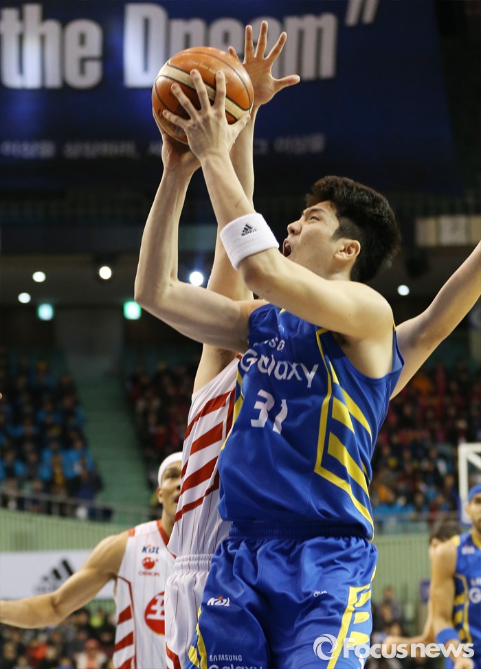 (서울=포커스뉴스) 24일 서울 잠실실내체육관에서 열린 2015-2016 프로농구 삼성-오리온 경기에서 삼성 김준일이 오리온 이승현의 마크를 피하며 점프슛을 시도하고 있다.