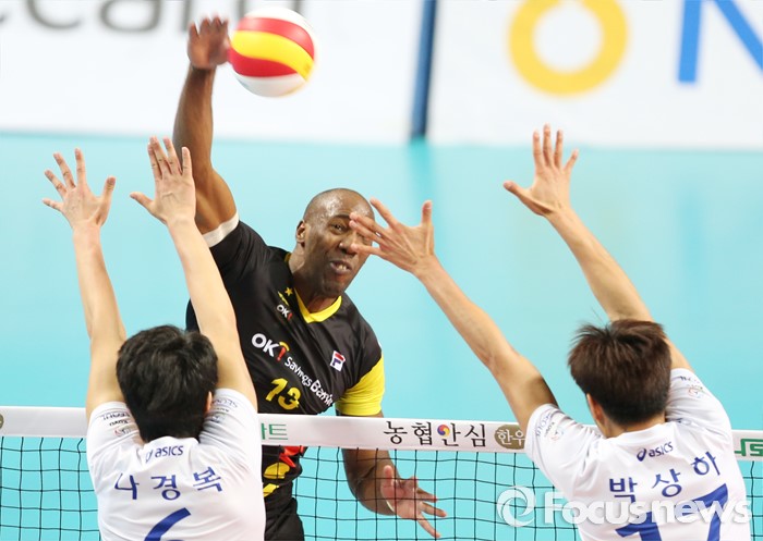 OK저축은행은 무엇보다 블로킹 12득점을 올리며 우리카드의 공격의 맥을 끊었다. 우리카드는 알렉산더(17득점)가 힘을 냈지만 국내선수들의 득점 가세가 적어 승부에 어려움을 겪었다.(서울=포커스뉴스) 30일 장충체육관에서 열린 '2015-2016NH농협 V-리그' 남자부 우리카드-OK저축은행 경기에서 OK저축은행 시몬이 우리카드 나경복, 박상하의 블로킹을 앞에 놓고 강력한 스파이크를 넣고 있다. 2015.12.30 우정식 기자