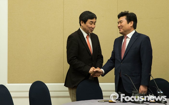 (서울=포커스뉴스) 새누리당 원유철(오른쪽), 더불어민주당 이종걸 원내대표가 24일 오후 서울 여의도 국회 귀빈식당에서 선거구획정안과 쟁정법안을 처리하기 위한 회동에 참석, 악수를 하고 있다.