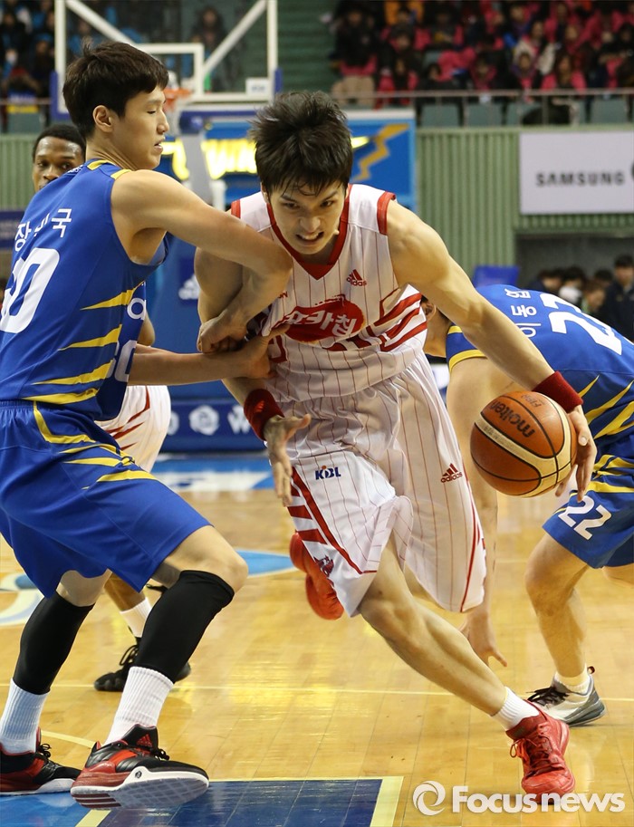 (서울=포커스뉴스) 24일 서울 잠실실내체육관에서 열린 2015-2016 프로농구 삼성-오리온 경기에서 오리온 장재석이 삼성 장민국을 제치면서 돌파를 시도하고 있다.