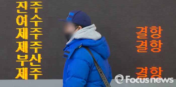 (서울=포커스뉴스) 25일 오전 서울 김포공항 국내선 청사에 제주에서 김포로 오는 항공편의 결항 안내문이 게시되고 있다.