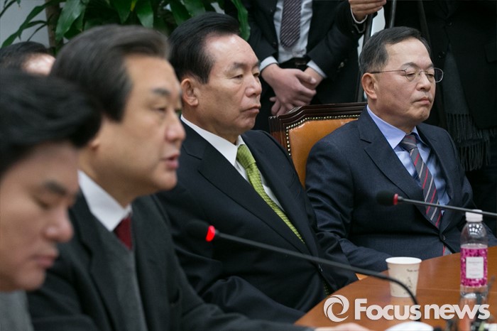 (서울=포커스뉴스) 지명직 최고위원에 임명된 안대희(오른쪽) 전 대법관이 25일 오전 서울 여의도 국회에서 열린 새누리당 최고위원회의에 참석해, 김무성(왼쪽 두번째) 대표의 모두발언을 경청하고 있다.