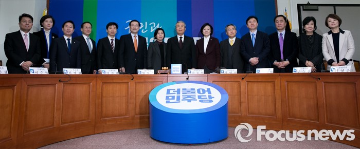 (서울=포커스뉴스) 25일 오전 서울 여의도 국회에서 열린 더불어민주당 1차 중앙선거대책위원회의에 참석한 김종인 위원장과 선대위원들이 취재진을 향해 포즈를 취하고 있다. 왼쪽부터 이철희, 유은혜, 박범계, 이수혁, 김병관, 이용섭, 양향자 선대위원, 김 위원장, 박영선, 우윤근, 김영춘, 정장선, 손혜원, 진선미 선대위원.