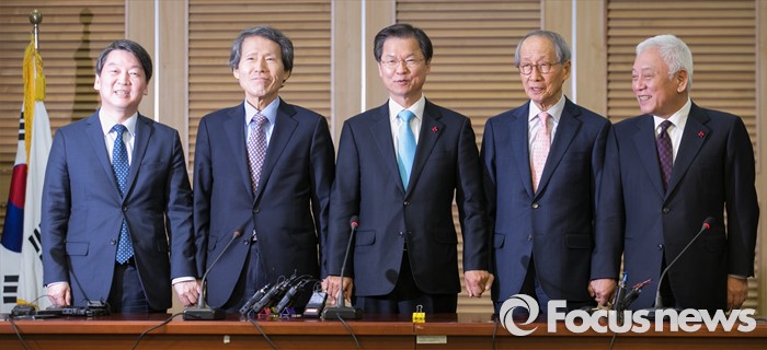 (서울=포커스뉴스) 25일 오전 서울 여의도 국회 의원회관에서 국민의당-국민회의 통합발표 기자회견을 마친 뒤 안철수(왼쪽부터) 국민의당 인재영입위원장, 한상진 공동창당준비위원장, 천정배 국민회의 창당준비위원장, 윤여준 국민의당 공동창당준비위원장, 김한길 상임부위원장이 취재진을 향해 포즈를 취하고 있다.