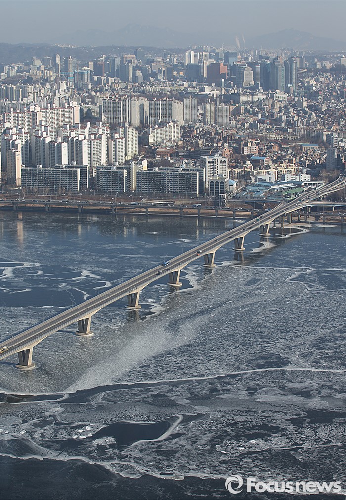 (서울=포커스뉴스) 연일 강추위가 계속되고 있는 25일 오전 서울 영등포구 63빌딩에서 바라본 한강 일대가 얼어붙어 있다.