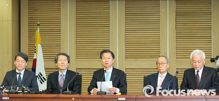(서울=포커스뉴스) 25일 오전 서울 여의도 국회 의원회관에서 열린 국민의당-국민회의 통합발표 기자회견에 참석한 안철수(왼쪽부터) 국민의당 인재영입위원장, 한상진 공동창당준비위원장, 천정배 국민회의 창당준비위원장, 윤여준 국민의당 공동창당준비위원장, 김한길 상임부위원장이 회견문을 낭독하고 있다.