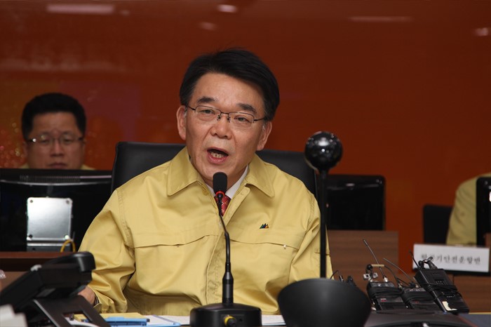 (세종=포커스뉴스) 강호인 국토교통부 장관이 25일 오전 세종시정부세종청사 국토부 국가교통정보센터에 마련된 제주공항체류여객 비상수송대책본부를 방문해 현황 점검을 하고 있다. <사진제공=국토교통부>