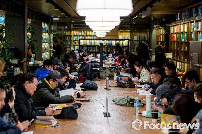 (서울=포커스뉴스) 서울 한 낮 기온이 영하권에 머물며 연일 강추위가 이어지고 있는 25일 오후 서울 종로구 교보문고 광화문점을 찾은 고객들이 추위를 피하며 독서 하고 있다.