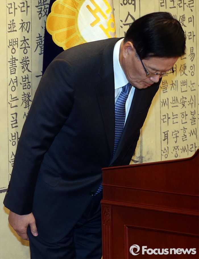 (서울=포커스뉴스) 정의화 국회의장이 25일 오후 서울 여의도 국회에서 20대 총선 불출마 선언 및 국회 선진화법 개정안에 대한 중재안 발표 기자회견을 마친 뒤 인사하고 있다.