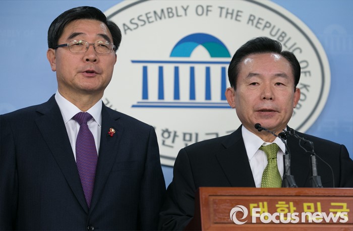 (서울=포커스뉴스) 이기권(왼쪽) 고용노동부 장관과 이인제 새누리당 노동선진화특위원장 등 의원들이 25일 오후 서울 여의도 국회 정론관에서 노동개혁 2대 지침(일반해고 지침, 취업규칙 지침) 설명회를 마친 뒤 브리핑을 하고 있다.