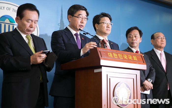 (서울=포커스뉴스) 이기권 고용노동부 장관과 이인제 새누리당 노동선진화특위원장 등 의원들이 25일 오후 서울 여의도 국회 정론관에서 노동개혁 2대 지침(일반해고 지침, 취업규칙 지침) 설명회를 마친 뒤 브리핑을 하고 있다.