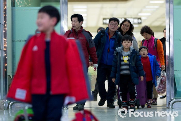 (서울=포커스뉴스) 폭설과 한파로 사흘째 운항이 중단됐던 제주공항에 갇혀있던 탑승객들이 25일 오후 서울 강서구 김포국제공항 국내선으로 입국하고 있다.