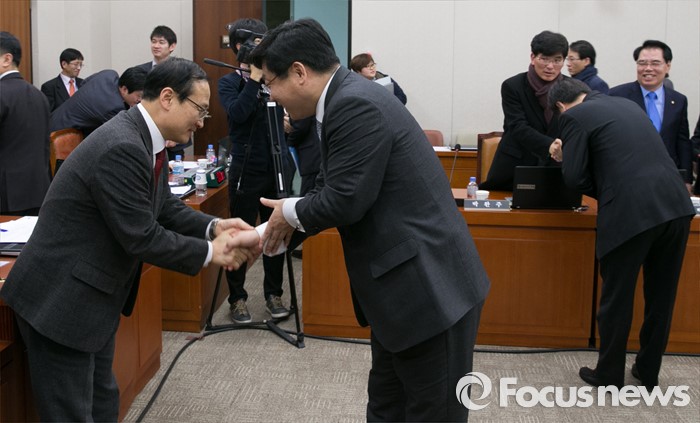 (서울=포커스뉴스) 25일 오후 서울 여의도 국회에서 산업통상자원위원회 전체회의가 산회된 후 주형환 산업통상자원부 장관과 홍영표 위원장 직무대리가 악수하고 있다. 이날 산업위는 기업활력제고를 위한 특별법(일명 원샷법)을 의결했다.
