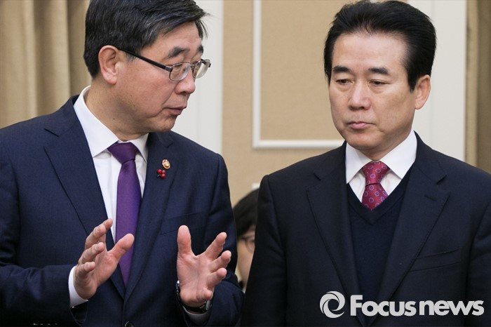 (서울=포커스뉴스) 이기권(왼쪽) 고용노동부 장관과 나성린 새누리당 민생119본부장이 26일 오전 서울 여의도 국회 귀빈식당에서 열린 '임금 체불 및 하도급대금 부조리 해결' 합동 당정협의에 참석해 대화하고 있다.