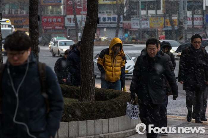 (서울=포커스뉴스) 서울 지역에 눈이 내리고 있는 26일 오전 서울 중구 남대문 일대에서 직장인들이 내리는 눈을 맞으며 출근길을 재촉 하고 있다.
