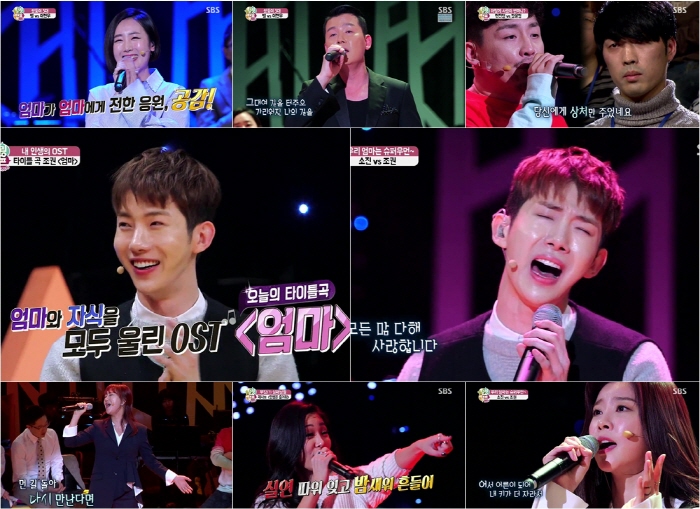 천가 팀의 조권은 25일 방송된 SBS '힐링캠프-500인(이하 ‘힐링캠프’)'에서 라디의 ‘엄마’를 불렀다. 강산애의 ‘넌 할 수 있어’를 부른 별, 고(故)김현식의 ‘내사랑 내 곁에’를 부른 현진영, ‘인생은 즐거워’를 부른 제시를 제치고 500인이 즉석에서 선정한 ‘내 인생의 OST 타이틀곡’에 선정되는 기쁨을 맛보게 됐다. 세상 엄마에게 바치는, 모든 자식들에게 바치는 진심이 통한 것이다.