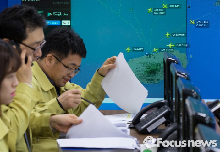 (세종=포커스뉴스) 26일 오전 세종시 정부세종청사 국토교통부 제주공항체류여객 비상수송대책본부에서 관계자들이 제주도 인근 운항상황을 점검하고 있다.