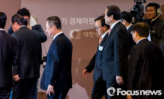 (서울=포커스뉴스) 박용만(왼쪽 두 번째) 대한상공회의소 회장과 김무성(왼쪽 네 번 째) 새누리당 대표가 26일 오전 서울 중구 대한상공회의소 국제회의장에서 열린 '중장기 경제어젠다 추진 전략회의'에 자리하기 위해 회의장으로 들어서고 있다. 이날 회의에 자리한 여야정 대표 및 산학연 대표 70여명은 규제 근본 틀 개선, 기업문화 개선, 국민 행복 위한 서비스 발전 등을 논의 할 예정이다.