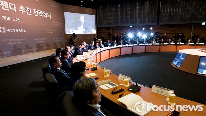 (서울=포커스뉴스) 문재인 더물어민주당 대표가 26일 오전 서울 중구 대한상공회의소 국제회의장에서 열린 '중장기 경제어젠다 추진 전략회의'에 자리해 축사하고 있다. 이날 회의에 자리한 여야정 대표 및 산학연 대표 70여명은 규제 근본 틀 개선, 기업문화 개선, 국민 행복 위한 서비스 발전 등을 논의 할 예정이다.