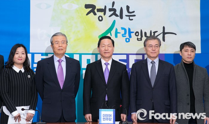 (서울=포커스뉴스) 26일 오전 서울 여의도 국회에서 열린 더불어민주당 인재영입위원회 1차 회의에 참석한 문재인(오른쪽 두번째부터) 대표, 김상곤 인재영입위원장, 김종인 선대위원장 등 위원들이 취재진을 향해 포즈를 취하고 있다.