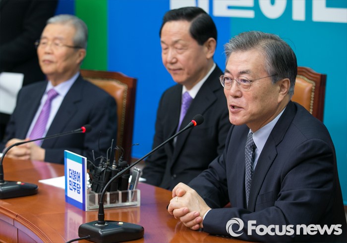 (서울=포커스뉴스) 26일 오전 서울 여의도 국회에서 열린 더불어민주당 인재영입위원회 1차 회의에 참석한 문재인 대표가 모두발언을 하고 있다. 왼쪽부터 김종인 선대위원장, 김상곤 인재영입위원장, 문 대표.