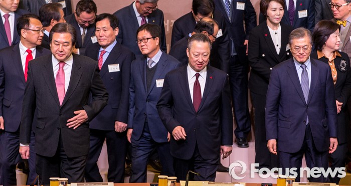 (서울=포커스뉴스) 박용만(가운데) 대한상공회의소 회장, 김무성(왼쪽) 새누리당 대표, 문재인 더불어민주당 대표가 26일 오전 서울 중구 대한상공회의소 국제회의장에서 열린 '중장기 경제어젠다 추진 전략회의'에서 사진촬영을 마친 뒤 자리로 향하고 있다. 이날 회의에 자리한 여야정 대표 및 산학연 대표 70여명은 규제 근본 틀 개선, 기업문화 개선, 국민 행복 위한 서비스 발전 등을 논의 할 예정이다.