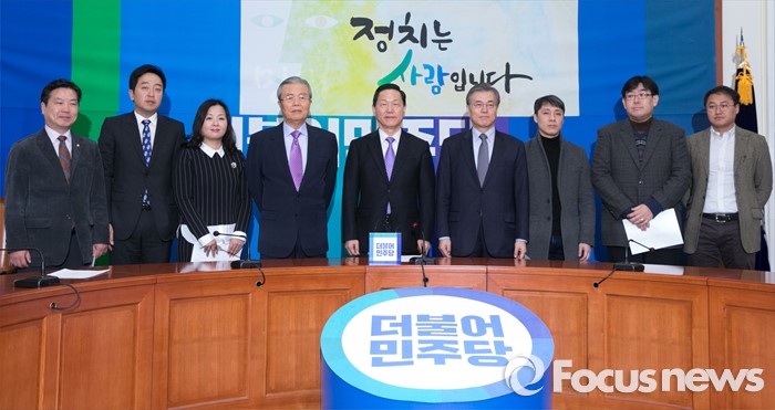 (서울=포커스뉴스) 26일 오전 서울 여의도 국회에서 열린 더불어민주당 인재영입위원회 1차 회의에 참석한 문재인(오른쪽 네번째부터) 대표, 김상곤 인재영입위원장, 김종인 선대위원장 등 위원들이 취재진을 향해 포즈를 취하고 있다.