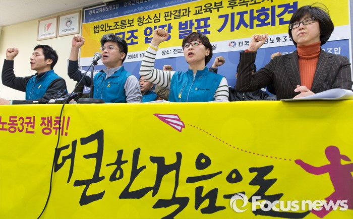 (서울=포커스뉴스) 26일 오전 서울 서대문구 전국교직원노동조합 대회의실에서 변성호(왼쪽 두번째) 전교조 위원장과 박옥주 전교조 수석부위원장이 법외노조통보 항소심 판결과 교육부 후속조치에 대한 전교조 입장 발표 기자회견에 참석해 인사말을 하고 있다.