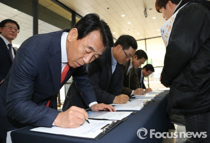 SK그룹은 서명 운동 본부와 함께 SK그룹 인트라넷을 통해 임직원 대상 온라인 서명운동도 진행하고 있다.김창근 SK SUPEX추구협의회 의장과 임형규 SK 정보통신기술위원장(ICT)위원장 등 SK 경영진은 이날 오전 서울 종로구 SK 서린사옥 1층 로비에서 명부에 서명했다.<사진제공=SK그룹> 2016.1.26. 조윤성 기자 cool@focus.co.kr