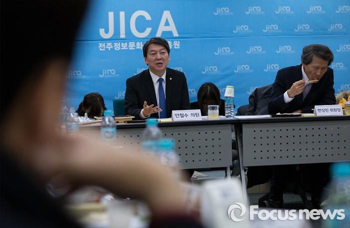 (전주=포커스뉴스) 국민의당 안철수 의원과 한상진 공동 창준위원장이 26일 오후 전주시 완산구 전주정보문화산업진흥원 IT벤처센터에서 벤처기업 종사자들과 함께하는 도시락 간담회를 갖고 있다.