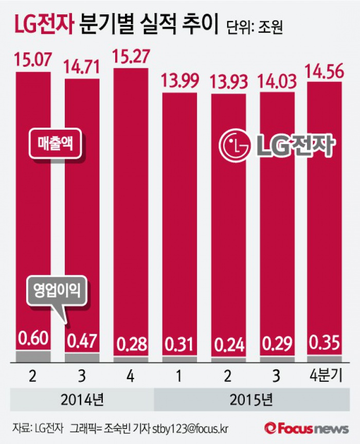 (서울=포커스뉴스) LG전자는 26일 지난해 4분기 영업이익은 3490억원으로 3분기 대비 18.7%증가했으며, 매출액은 14조5601억원으로 3분기보다 3.5% 중거한 수치라고 공시했다.