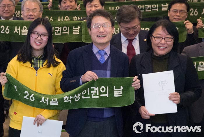 (서울=포커스뉴스) 26일 오후 서울 중구 한국프레스센터에서 열린 '1.26 서울 학생 인권의 날 선포식'에 참석한 조희연(가운데) 서울시 교육감 등 참석자들이 학생 인권의 날 선포를 축하하고 있다.