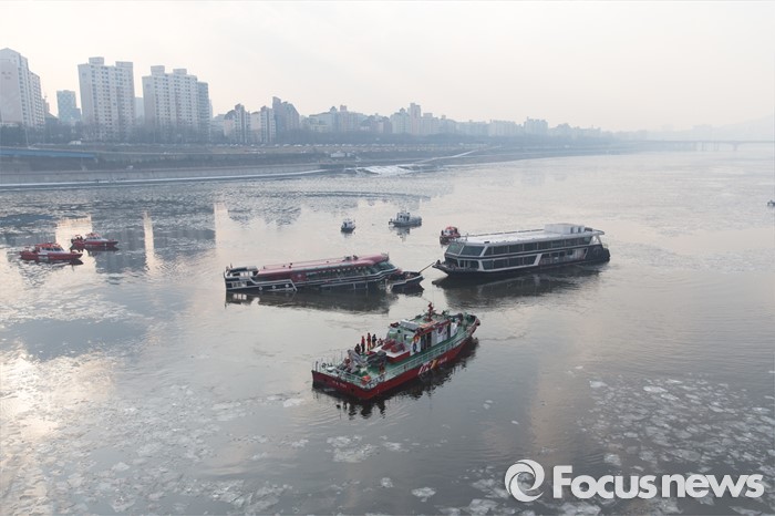 (서울=포커스뉴스) 26일 오후 서울 한강 영동대교 아래에서 한강유람선이 침수돼 구조대원들이 구조활동과 견인 작업을 하고 있다.