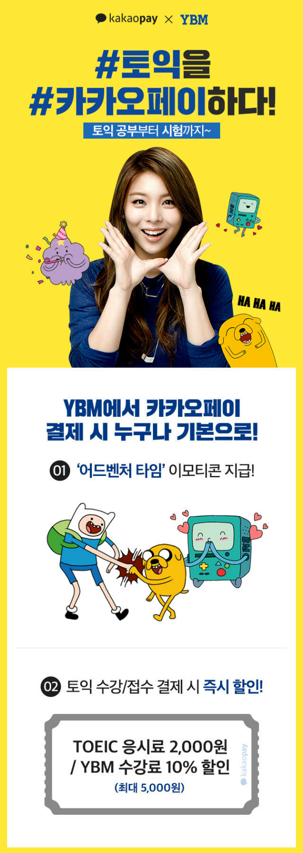 이번 프로모션은 이날부터 다음달 23일까지 카카오페이 간편결제로 YBM에서 토익 어학원 및 인터넷 수강료를 결제하면 10% 할인, 토익 응시료를 결제하면 2000원의 할인 혜택이 제공된다. 결제 고객 전원에게는 카툰 네트워크(Cartoon Network)의 인기 애니메이션 '핀과 제이크의 어드벤처 타임' 캐릭터 이모티콘도 지급한다.