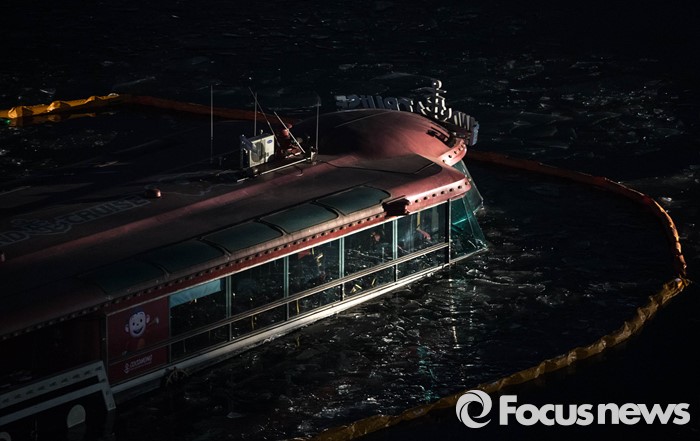 (서울=포커스뉴스) 26일 오후 서울 한강 영동대교 아래에서 한강유람선이 침수되어 선수 부분이 물에 잠겨 있다.