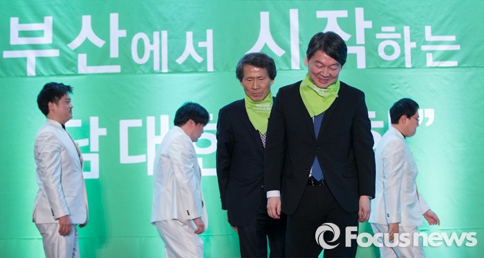 (부산=포커스뉴스)국민의당 안철수 의원과 한상진 공동 창준위원장이 26일 오후 부산 해운대구 벡스코에서 열린 국민의당 부산시당 창당대회에서 당원들의 환호에 답한 후 발언대에서 빠져나오고 있다.