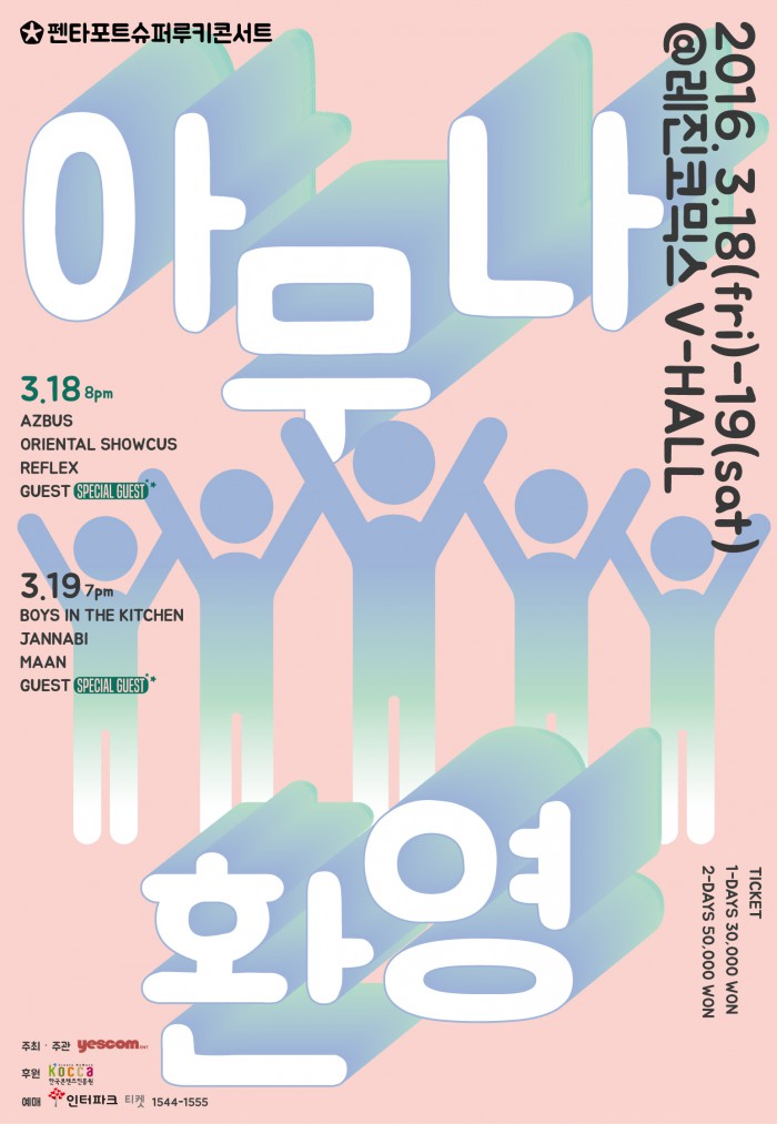 이번 공연의 얼리버드 티켓은 오는 27일 오후 2시부터 2월 10일까지 오픈된다. 인터파크에서 예매 가능하다. 예매가는 20% 할인된 1일권 24,000원, 2일권 40,000원이다.'2016 펜타포트 슈퍼루키 콘서트'(부제:'아무나 환영')가 오는 3월 18~19일 오후 서울 마포구 레진코믹스 브이홀에서 열린다. 사진은 행사를 알리는 포스터. <사진제공=예스컴이엔티>