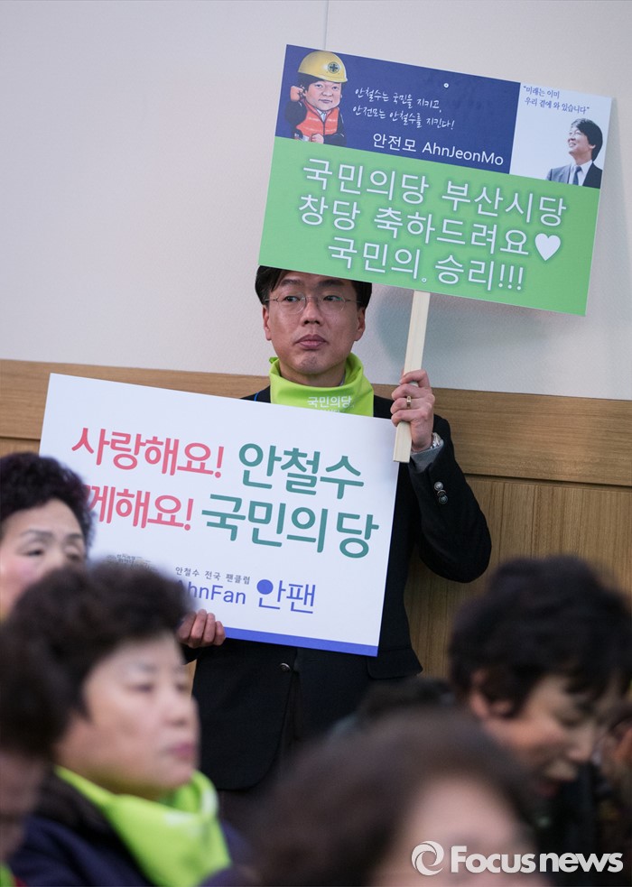 (부산=포커스뉴스) 26일 오후 부산 해운대구 벡스코에서 열린 국민의당 부산시당 창당대회에서 한 당원이 안철수를 지지하는 피켓을 들고 서 있다.