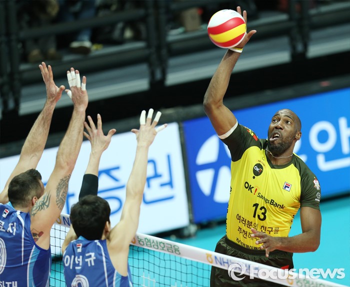 (안산=포커스뉴스) 26일 안산상록수체육관에서 열린 '2015-2016NH농협 V-리그' 남자부 OK저축은행-삼성화재 경기에서 OK저축은행 시몬이 삼성화재 그로저, 이선규의 블로킹을 향해 스파이크를 때리고 있다.