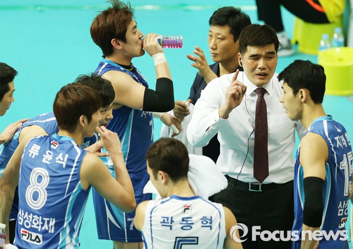 (안산=포커스뉴스) 26일 안산상록수체육관에서 열린 '2015-2016NH농협 V-리그' 남자부 OK저축은행-삼성화재 경기에서 삼성화재 임도헌 감독이 작전타임떄 선수들을 독려하고 있다.