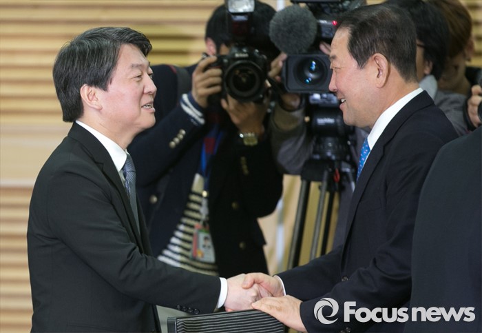 (서울=포커스뉴스) 27일 오전 서울 여의도 국회 의원회관에서 열린 국민의당-통합신당 통합발표 기자회견에 참석한 안철수(왼쪽) 국민의당 인재영입위원장과 박주선 통합신당 창당준비위원장이 인사하고 있다.