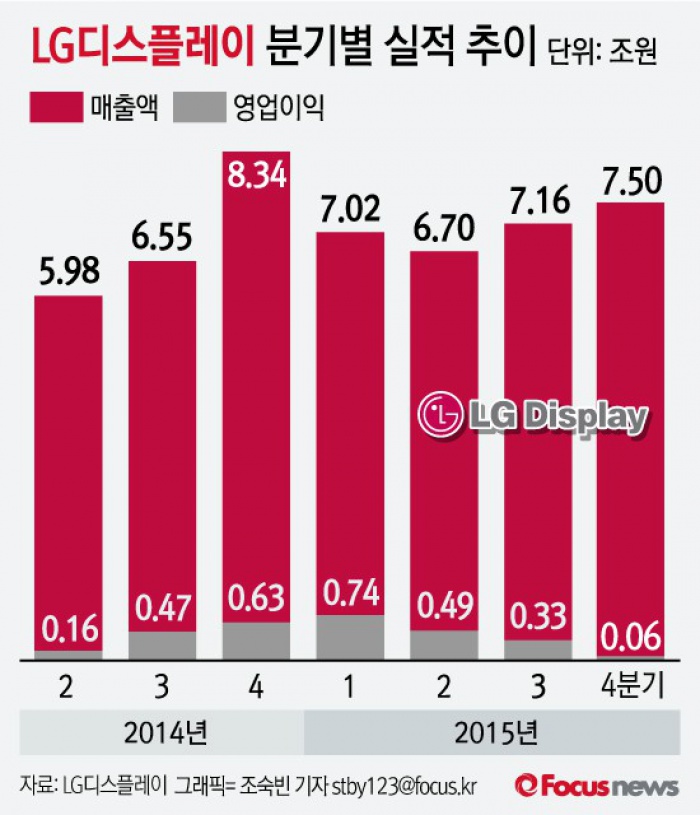 김상돈 LG디스플레이 최고재무책임자(CFO) 전무는 “2016년 1분기는 경기 불확실성 지속으로 수요회복을 기대하기는 쉽지 않은 상황이지만 차별화된 기술 경쟁력 분야에 집중하고 OLED 증설 투자 등 OLED(유기발광다이오드)를 통한 미래 준비 및 차별화 투자를 지속 추진해 시장의 신뢰와 가치를 창출하는 기업이 되겠다”고 말했다.(서울=포커스뉴스) 26일 LG디스플레이는 지난해 4분기 영업이익은 606억원이라고 공시했다. 이는 2014년 4분기(6268억원)에 비해 90.3% 하락한 실적이다.매출액은 7조4957억원으로 2014년 동기대비 10,1%줄어든 실적이다. 2016.01.26 조숙빈 기자
