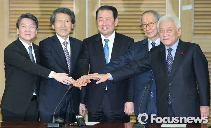 (서울=포커스뉴스) 27일 오전 서울 여의도 국회 의원회관에서 열린 국민의당-통합신당 통합발표 기자회견에 참석한 안철수(왼쪽부터) 국민의당 인재영입위원장, 한상진 공동창당준비위원장, 박주선 통합신당 창당준비위원장, 윤여준 국민의당 공동창당준비위원장, 김한길 상임부위원장이 취재진을 향해 포즈를 취하고 있다.