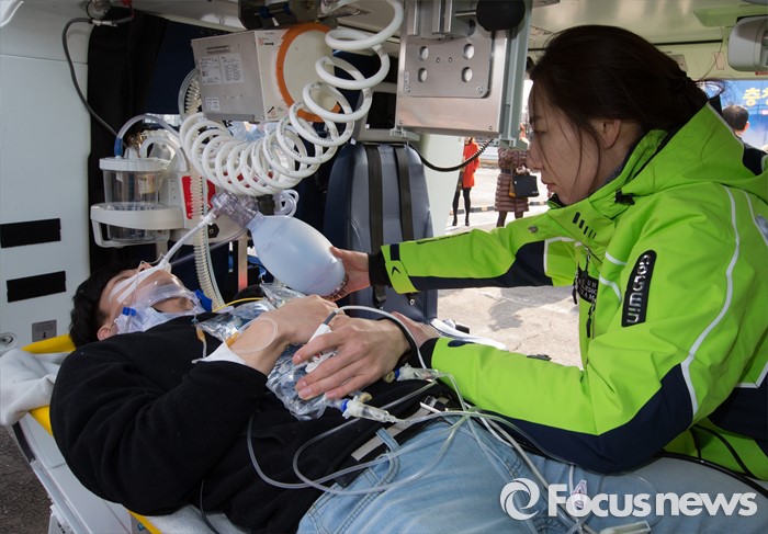 (천안=포커스뉴스) 27일 오후 충남 천안시 단국대학교병원에서 열린 충청남도 응급의료 전용헬기(닥터헬기) 출범식에서 의료진들이 가상 환자이송훈련을 하고 있다.