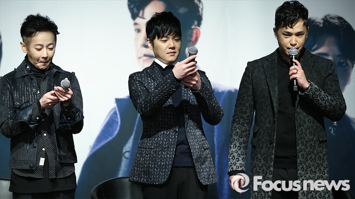 (서울=포커스뉴스) 27일 오후 서울 용산구 현대카드 언더스테이지에서 열린 엠씨 더 맥스(M.C The Max) 정규 8집 'pathos' 발표 기자간담회에 참석한 멤버 이수(오른족)가 인사말을 하고 있다. 왼쪽부터 제이윤, 전민혁, 이수.