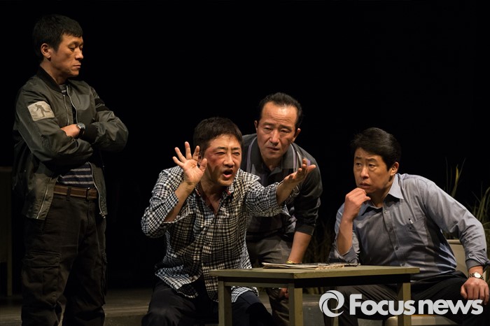 (서울=포커스뉴스) 27일 오전 서울 중구 명동예술극장에서 열린 연극 '날 보러와요' 프레스콜에 배우 김뢰하(조형사), 류태호(용의자), 유연수(박형사), 이대연(김반장)이 연기하고 있다.